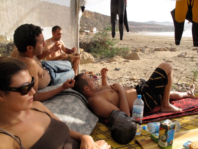 The next morning Karim took us to his secret surf spot at Rock Beach. It was a beautiful bay with what seemed to be an abandoned fishing village. We set up a little tent to protect us from the sun and spent the day surfing, and kicking it in the shade. The beach break was fun with a few small hollow barrels but the point break wasn’t working. It was nice to surf with only our buddies and to kick it on the beach all day.