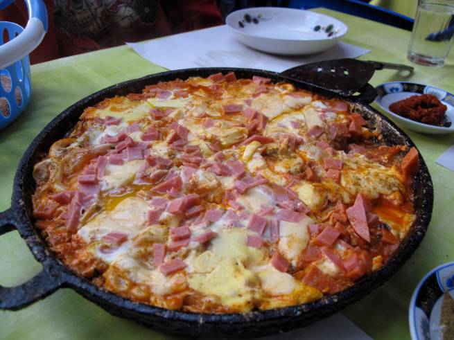 A strange and surprisingly delicious egg, ham, cheese, tomato and onion omelet thing.