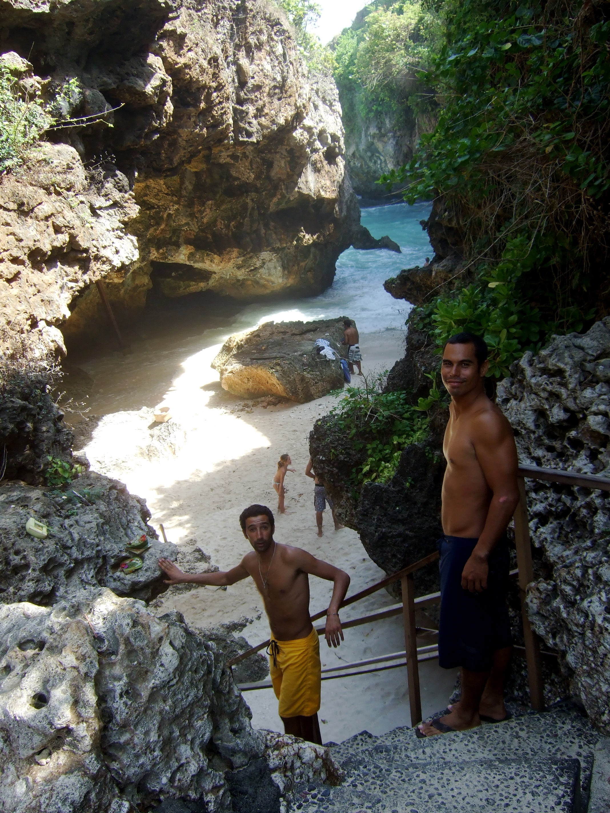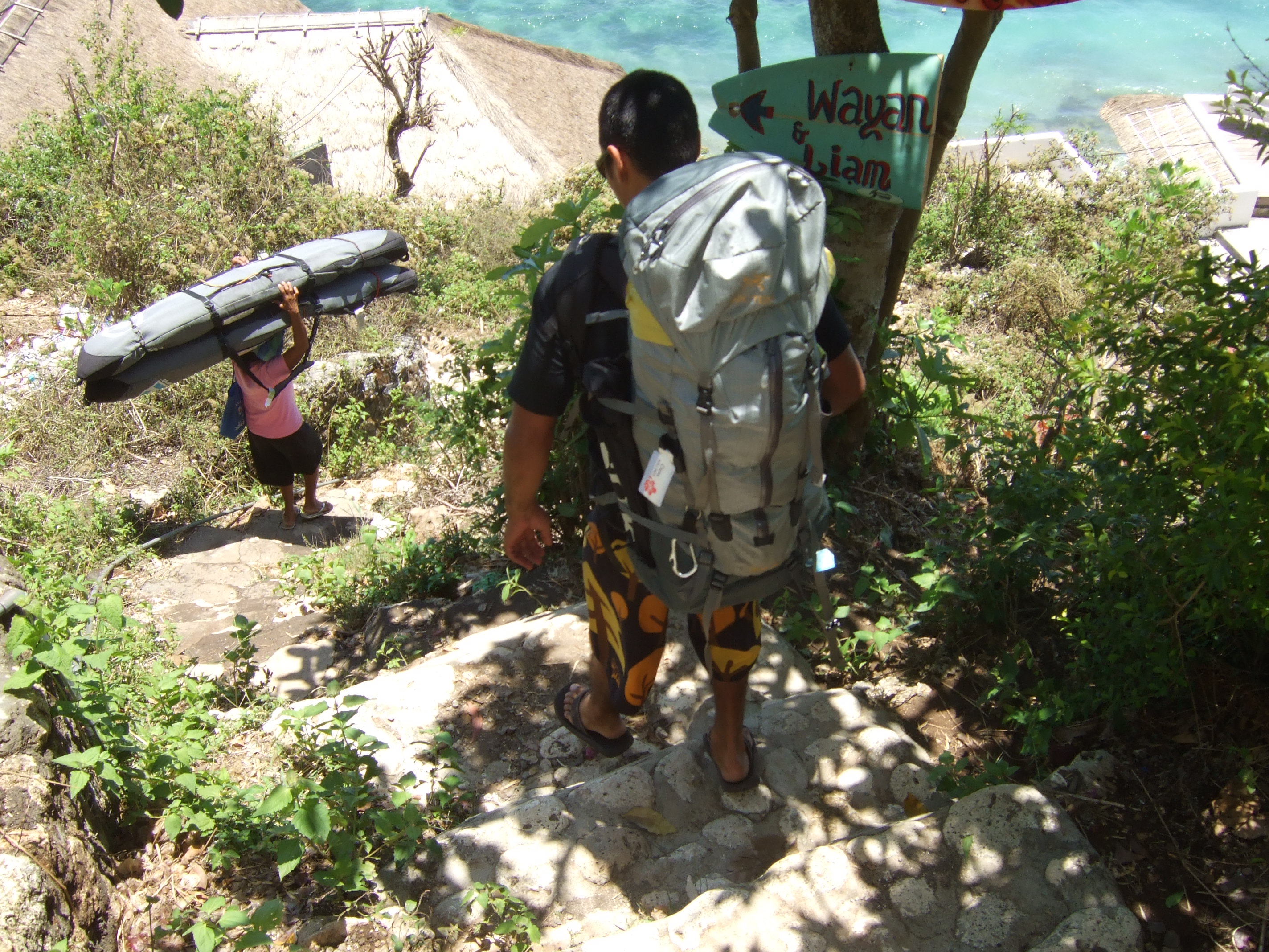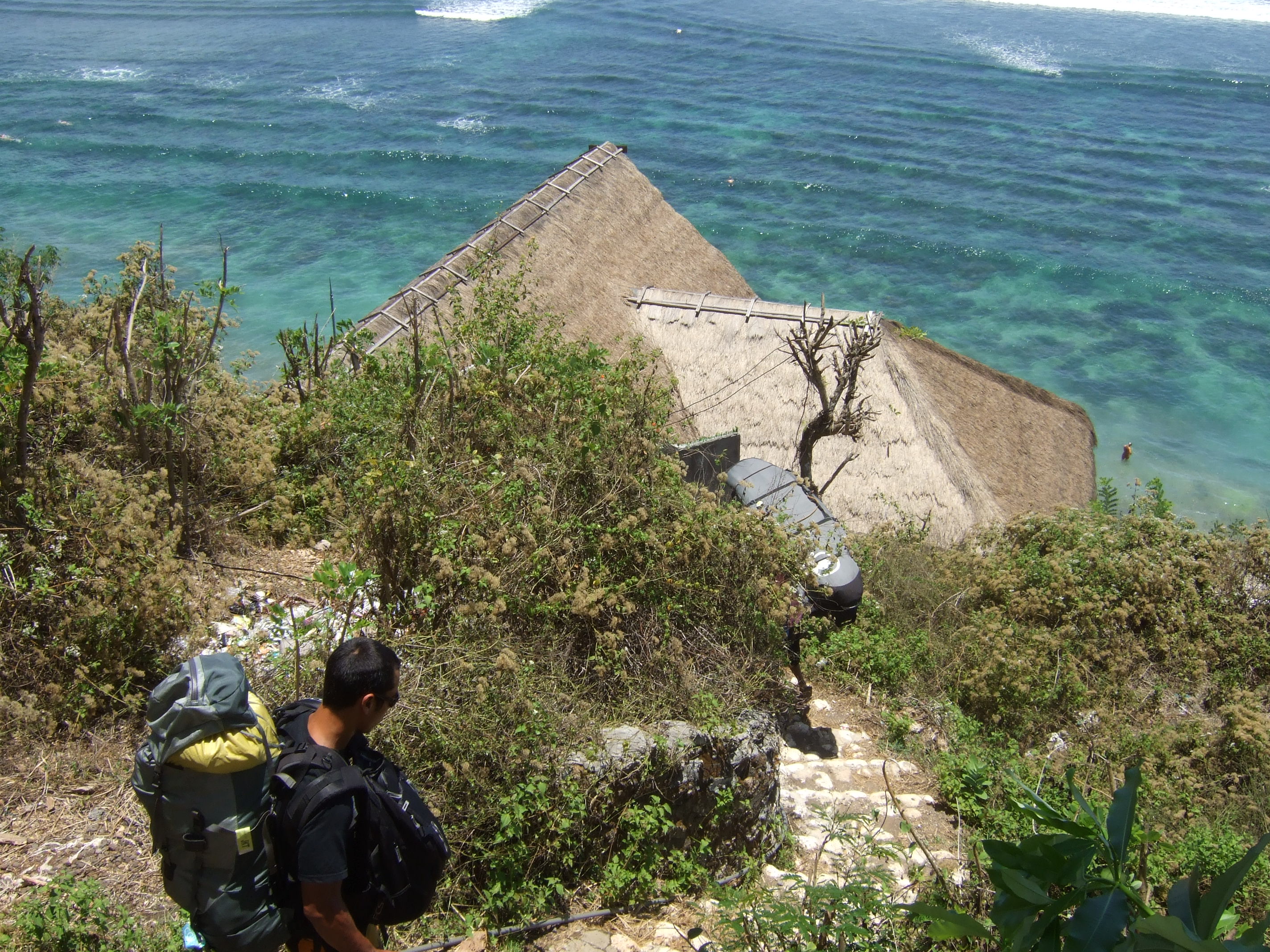 The entire area of the Uluwatu peninsula is called the bukit (hill) but Louise likes to call it the chicken foot. If you look at a map of Bali it looks like a chicken dropping a deuce. Bingin is on the bukit and the road ends at the top with a good trek required to get down to the beach. With all our bags we figured it would take us two trips but a lovely lady offered to take our boards down for a small fee.