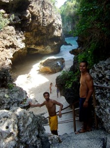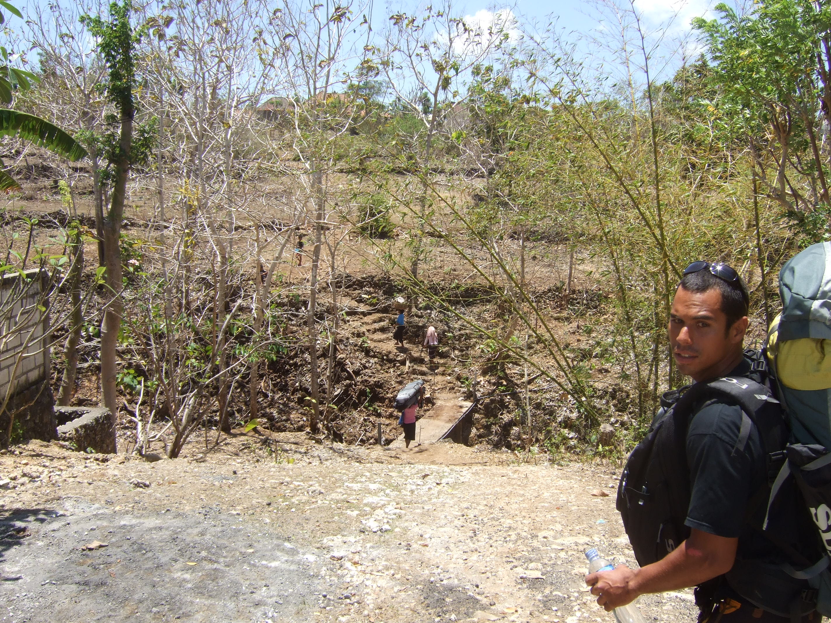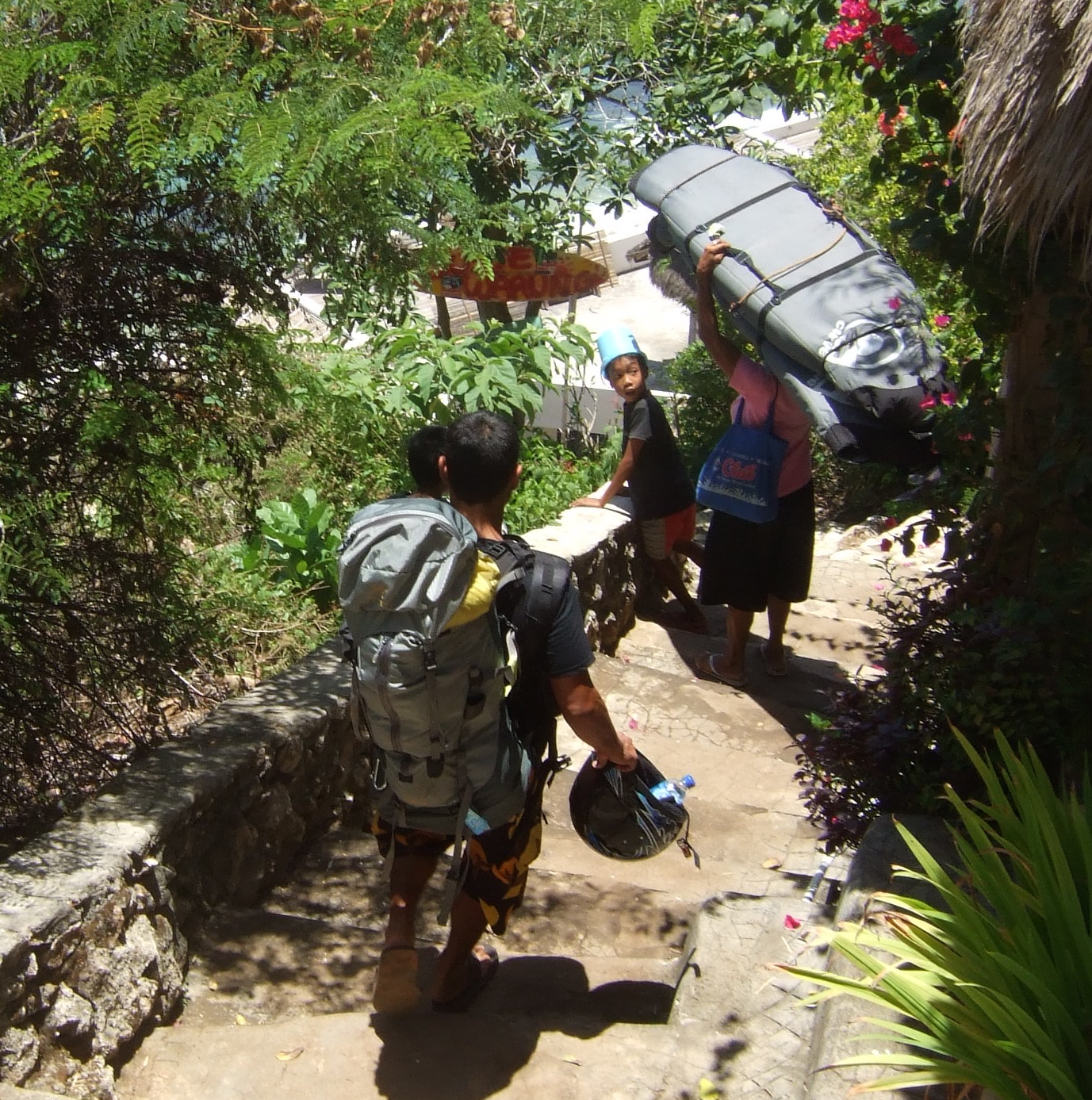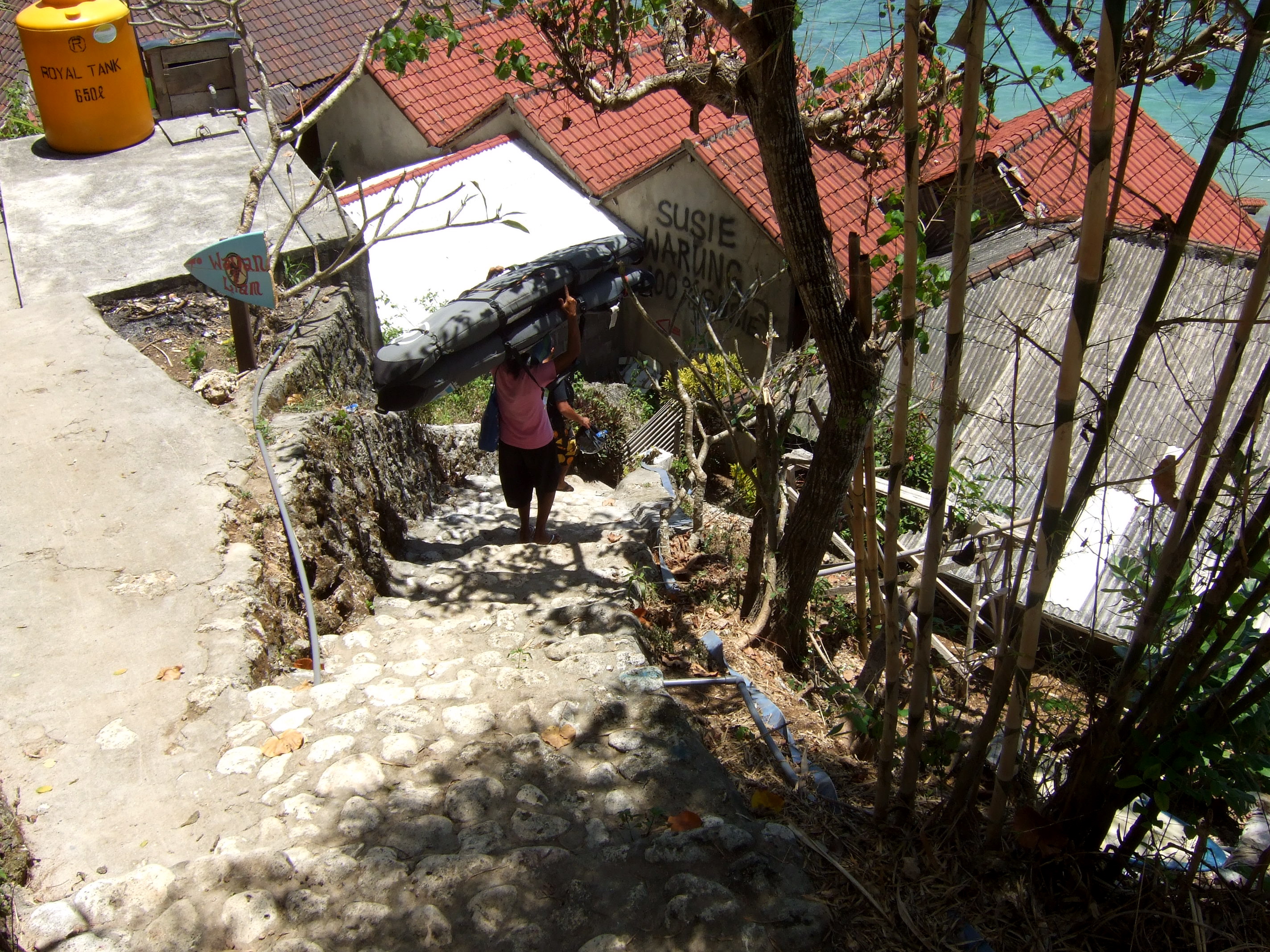 The entire area of the Uluwatu peninsula is called the bukit (hill) but Louise likes to call it the chicken foot. If you look at a map of Bali it looks like a chicken dropping a deuce. Bingin is on the bukit and the road ends at the top with a good trek required to get down to the beach. With all our bags we figured it would take us two trips but a lovely lady offered to take our boards down for a small fee.