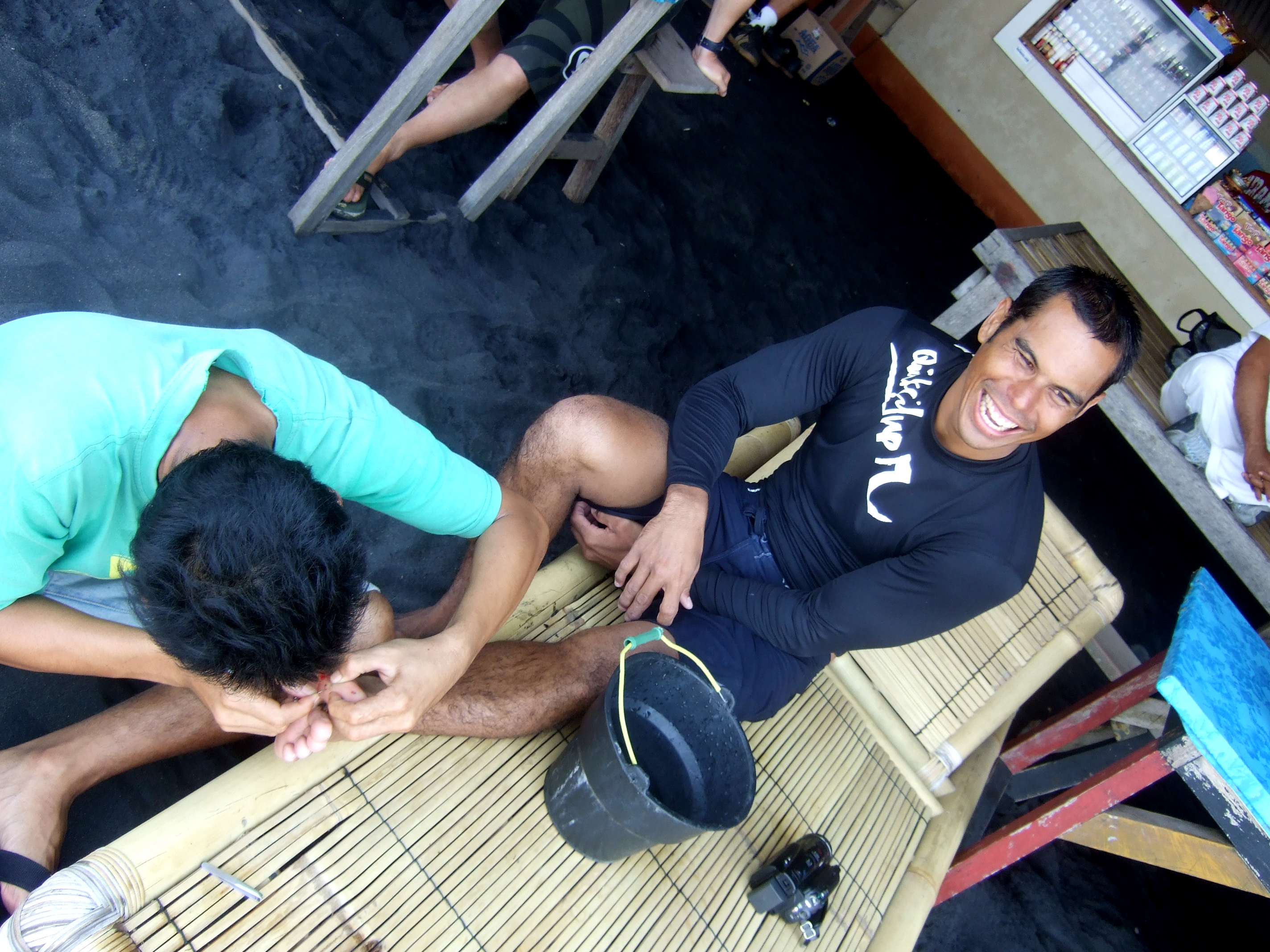 The urchin spines are a bitch to get out and when I came to the beach, one of the locals working at the Warung was fired up to help me out. The guy picked at my toe for a long time and got one out but was struggling on the others while Louise and John were giving me the look like, “hey this guy is butchering your toe!”