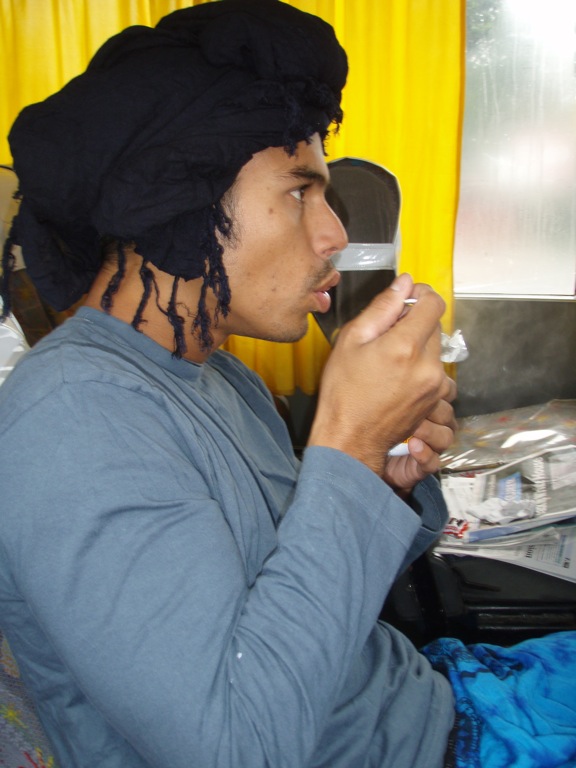 The bus was freezing cold. Here’s Kahi with his bundled head eating cup-a-noodle.