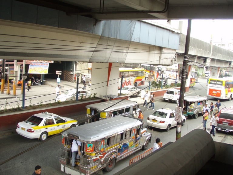 Public transportation everywhere! Notice the LRT to the left, the rasta colored public bus, and the jeepneys.