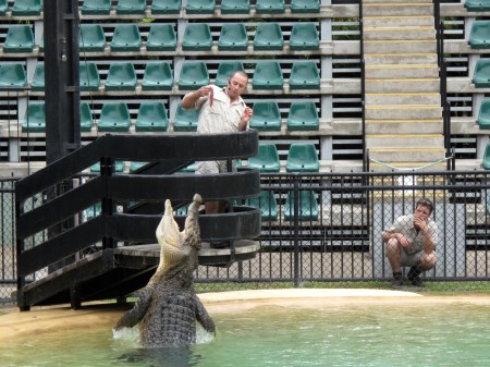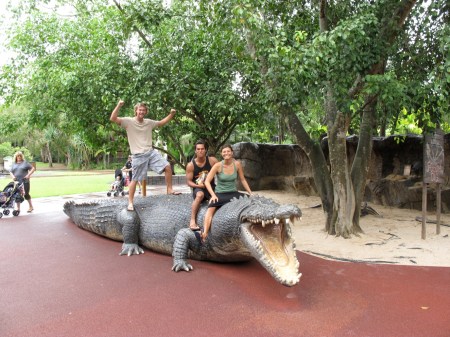 They had this show where they brought out birds and other animals. It was really neat to see them feed the crocs. It was an educational show that taught you a lot about the different animals in OZ and how to safely live amongst them. They had this one part of the show where they asked for volunteers to teach a bird call, then they would release the birds and they would land on your arm. Kahi was chosen as one of the four volunteers, they had then do the most hilarious bird call with a pelvic thrust He did an amazing job, but it was just a joke they played on the volunteers and no birds landed on their arms. It was so funny!