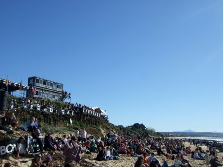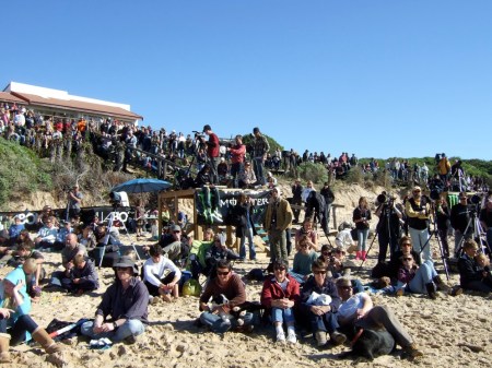 The special heats between Mark Occulipo and Tom Curren could have been a lot better if they had waves, but in both of their heats, the waves didn’t cooperate. Curren and Occy for non-surfers, are legends of the sport. It would be kind of like if Jordan came back to go one on one against Magic Johnson. Needless to say there were a lot of spectators for these heats. We watched both of their heats, and they were entertaining. I will have to say that Tom Curren is surfing better than Occy, but Occy when given an open face at Jbay continues to be the epitomy of back hand power surfing. In their history they have been in 16 heats with them going 8-8. Now they have been in 18, going 9-9. The suspense continues……..