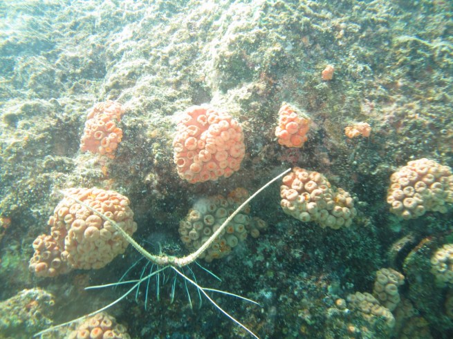 After lunch we just went exploring around the island. Once around the corner we ran into a bunch of tourists and we were pleased that our crew chose the secluded area. We could have walked all the way around the island had we chose, but a dive back in with the current before it turned was more to our liking. Todd and Kim went inland to explore and Louise and I cooled off. On this dive I saw the biggest Ulua I have ever seen in my life. We also saw a bunch of lobsters and countless other tasty morsels that were forsaken as the area was a marine sancutuary, which our boat crew managed to disregard.