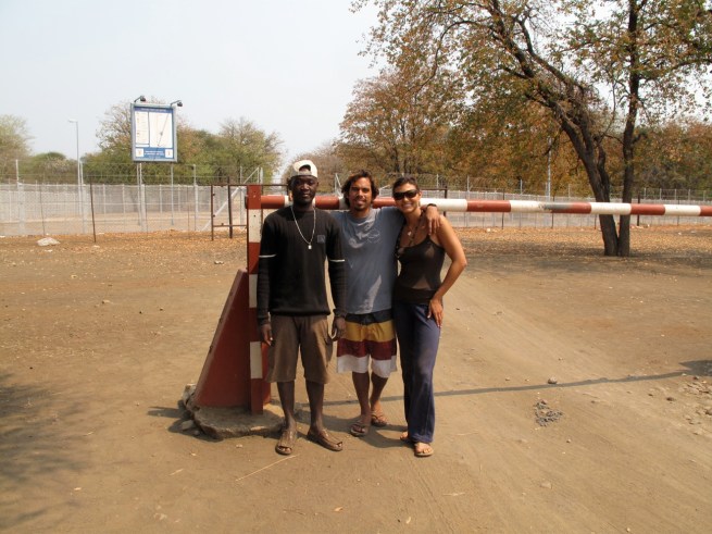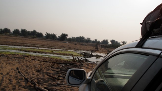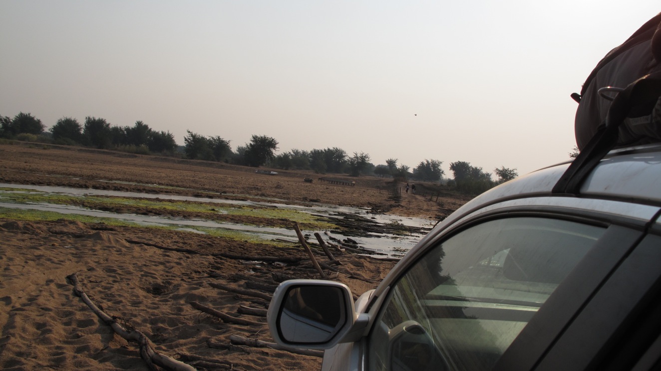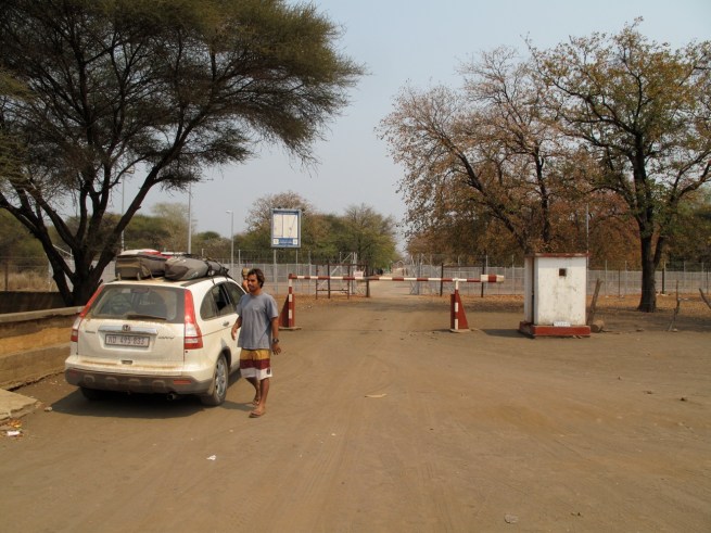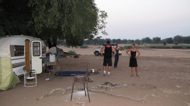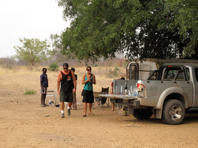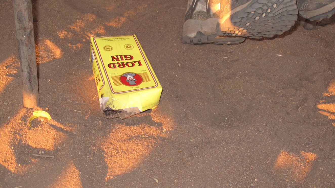 Flying through the dirt, rock, sand, and a mix of all those, Todd was focused to get us to the border by 5PM. We didn’t make it. At about 4PM around 80km from the border, 9 hours into the drive, the fourth car we’d seen all day stopped us. The two guys in the truck asked us where we were going. When we told them we were trying to get to the border they replied that it was impossible. They told us that they had a camp about 25km up the road and we could camp with them for the night. They had extra tents. We’ve seen a lot of horror movies, and my caution has kept Louise and I out of a lot of trouble thus far in our journey, but it seemed like we didn’t have any choice. We stopped about 10 km further down the road at a village of 6 huts and a little store. There were a bunch of locals and all we wanted to do was get a few beers. A few beers turned into a few more and before you knew it we wanted to get the hell out of there. They too let us know there was nowhere to stay at the border. Then they started getting really pushy about buying them some gin, gin in a box. The locals were beligerently drunk and I didn’t want to have to show them the one and two. We jumped in our car and got the hell out of dodge.