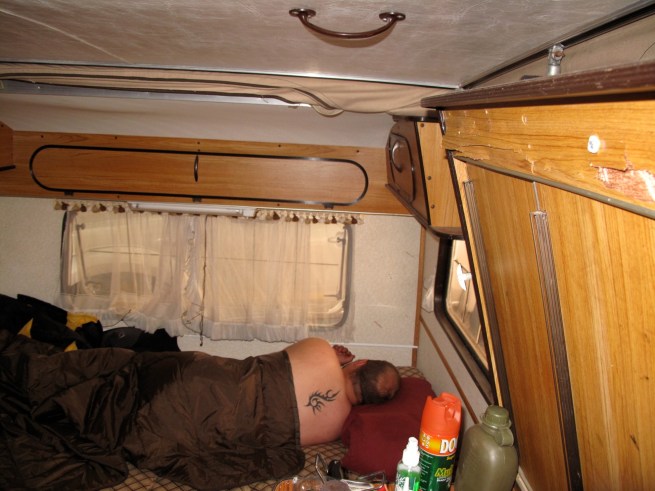 Another 20 km up the road we came across the strangers campsite. They had a trailer and a tarp covering all kinds of odd looking machinery. I was still a bit cautious, worried they were axe murderers or something.