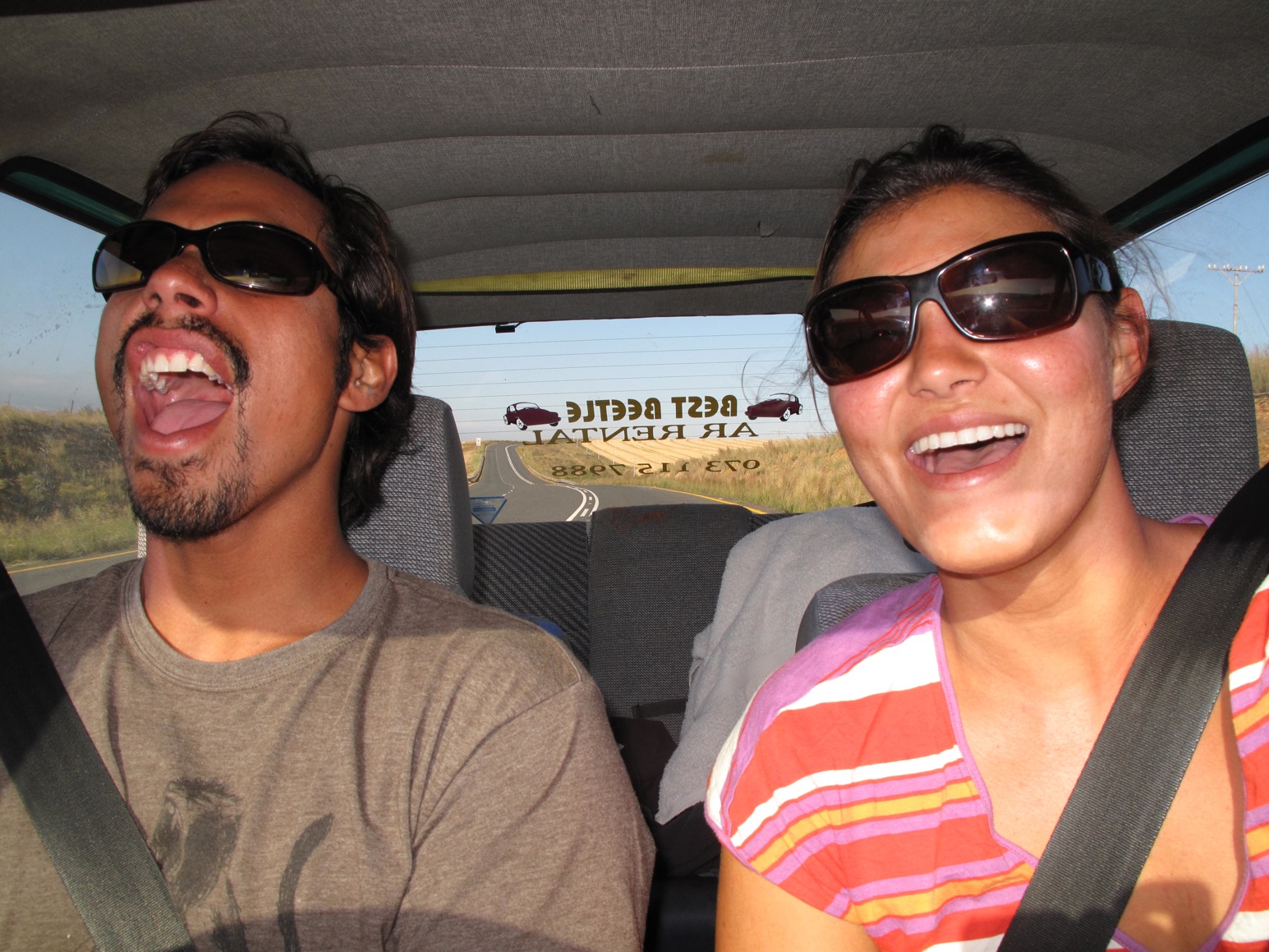 Our car had no stereo so much of our time was spent singing our own songs singing to the beats made by the surfboard bags and ropes banging on the roof of our sports car.