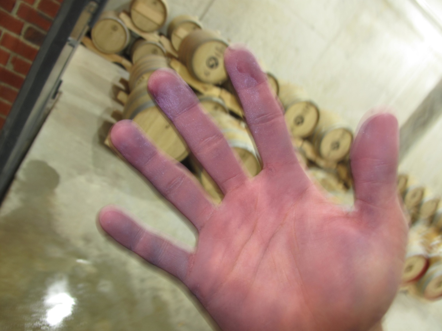 Once during the barrel time, around 8 months, they pump the wine out, clean the barrels and then pump the wine back in. Not for all varietals but for some and tasting the wine on my fingers was quite a treat. It was more like syrup. My shoes and hands were temporarily stained purple and later that night after multiple bottles of consumption that night, so were my teeth.