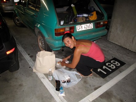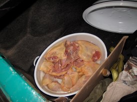 This is Louise marinating chicken in the parking lot. If you mix the marinade with carbon monoxide the bugga taste ono. Then you let it mix with the movement in the trunk while you drive a couple hunderd kilometers, broke da mouth brah.