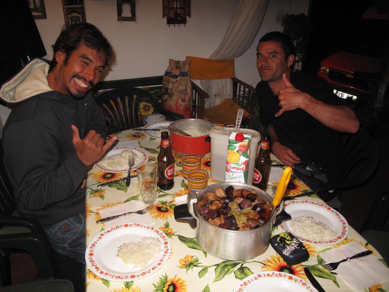 Kahi and Kyle looking forward to eating feijoada, all that cabbage and beans promised for a very competitive gave of fart tennis.