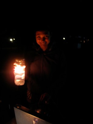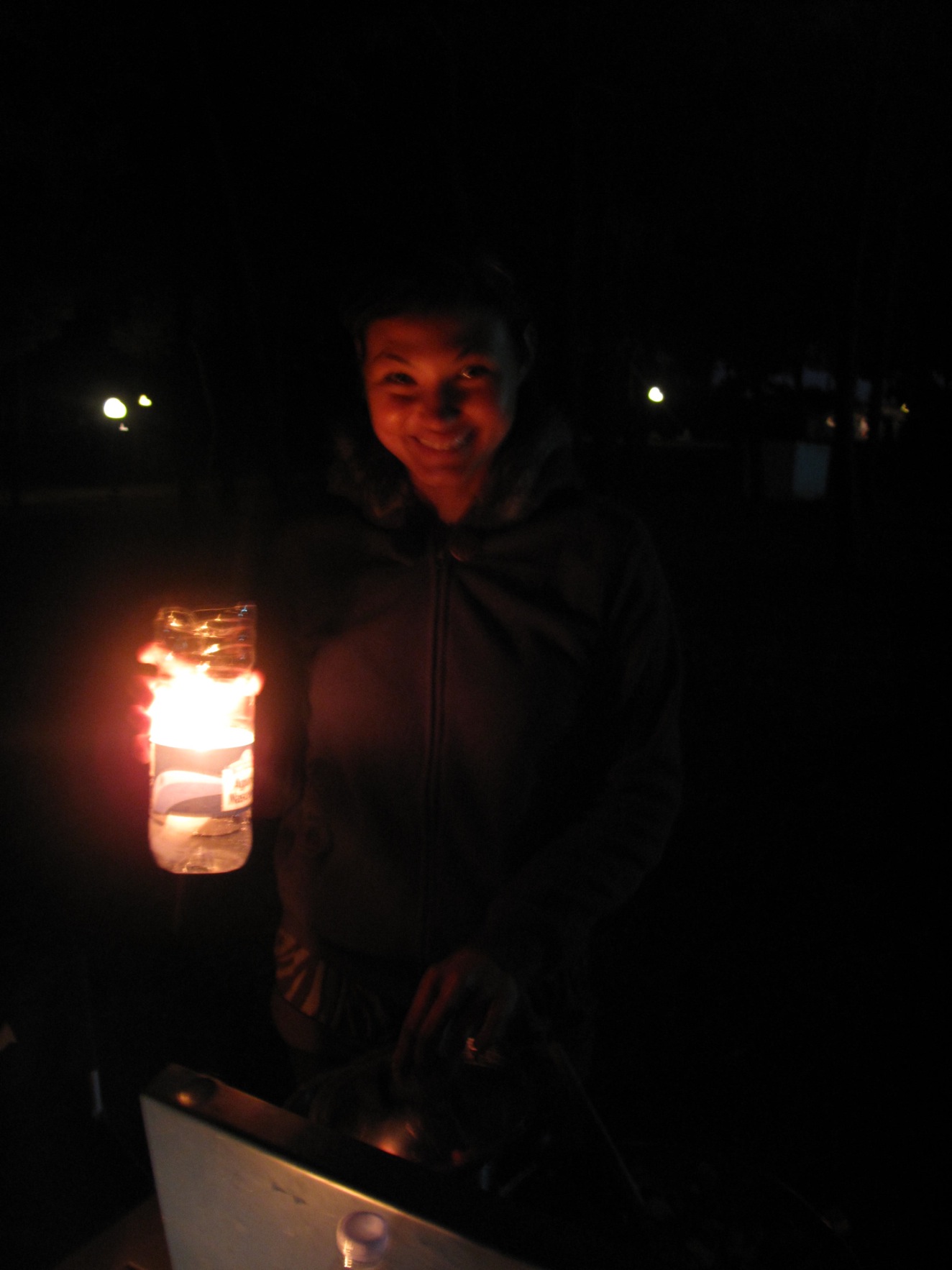 This is the light we invented, just a candle in a water bottle. But it works great keeping the wind from blowing out the candle.
