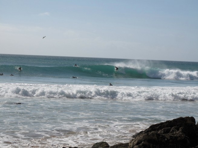 On the map it looks like a nubbin sticking off the coastline. Its a right point break that is sheltered from the strong Northerly winds and the Northwest swell was refracting nicely into the bay. When Louise and I paddled out it was about 6-8 foot Hawaiian (triple overhead). There was only one guy out but a few others were paddling out with us. The peak was slightly shifty but once you got a wave it was a non-stop adrenaline rush. First you got to do one turn and set up for the barrel. Then you needed to watch out for the giant rock that is a constant impediment. It is easy to hit and if you don’t keep your eye out for the rock, your day (maybe life) will be ruined. The rest of the pack decided to surf past the rock. I came just short of nailing it twice and after the tide sucked out too far and the rock grew to building size I figured it was time to call it a day. On the entire western coast of Portugal I think that was the only wave working. I couldn’t believe that there was only one other guy I was sharing the peak with. But after speaking with other locals, they said that rock scares the shit out of them. Me too.