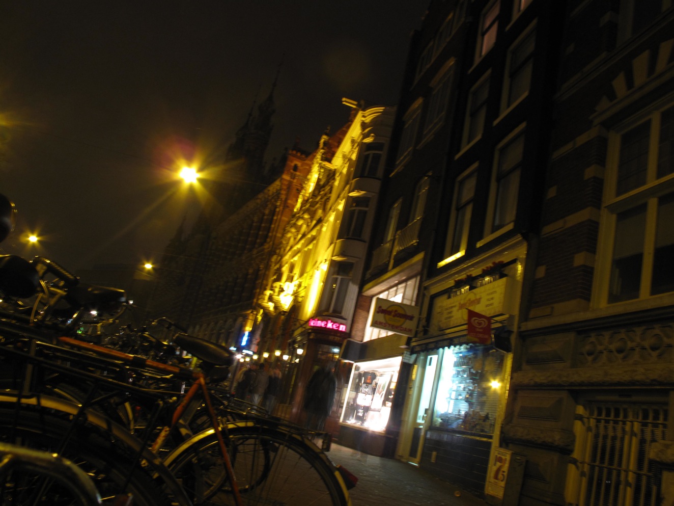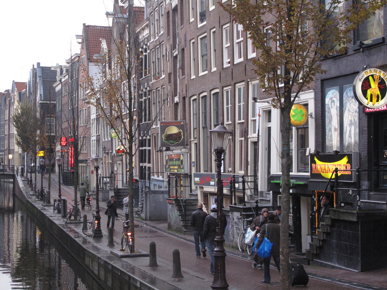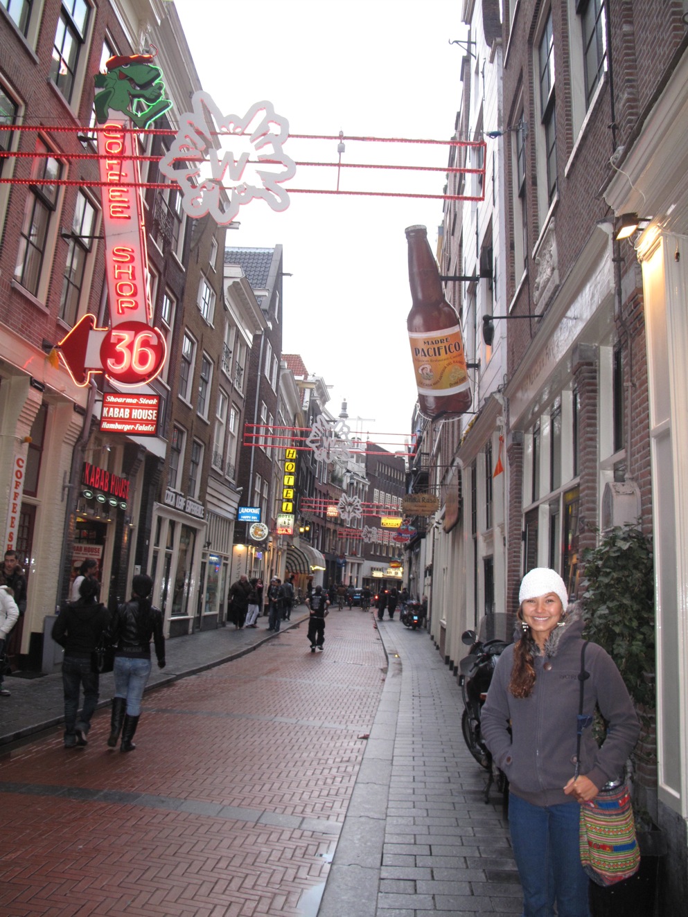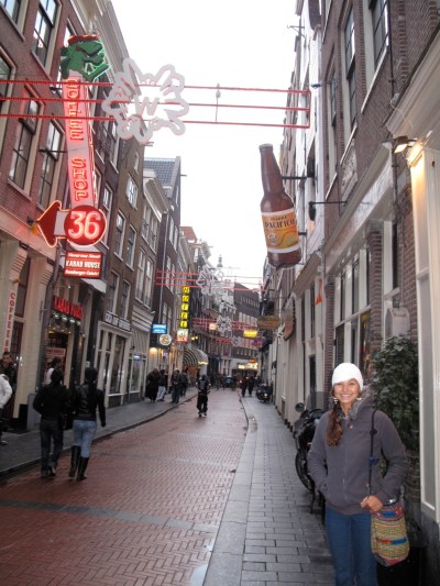 After paying a short visit to a coffee shop we went for a stroll around town. We were weaving up and down the small alleyways and when all of a sudden I looked up and saw boobs. I assumed the little red lights above the doorways and the boobs meant we were in the red light district. Girls of all shapes and sizes from every fantasy you could imagine sat in display cases waiting for their next customer. It was crazy!