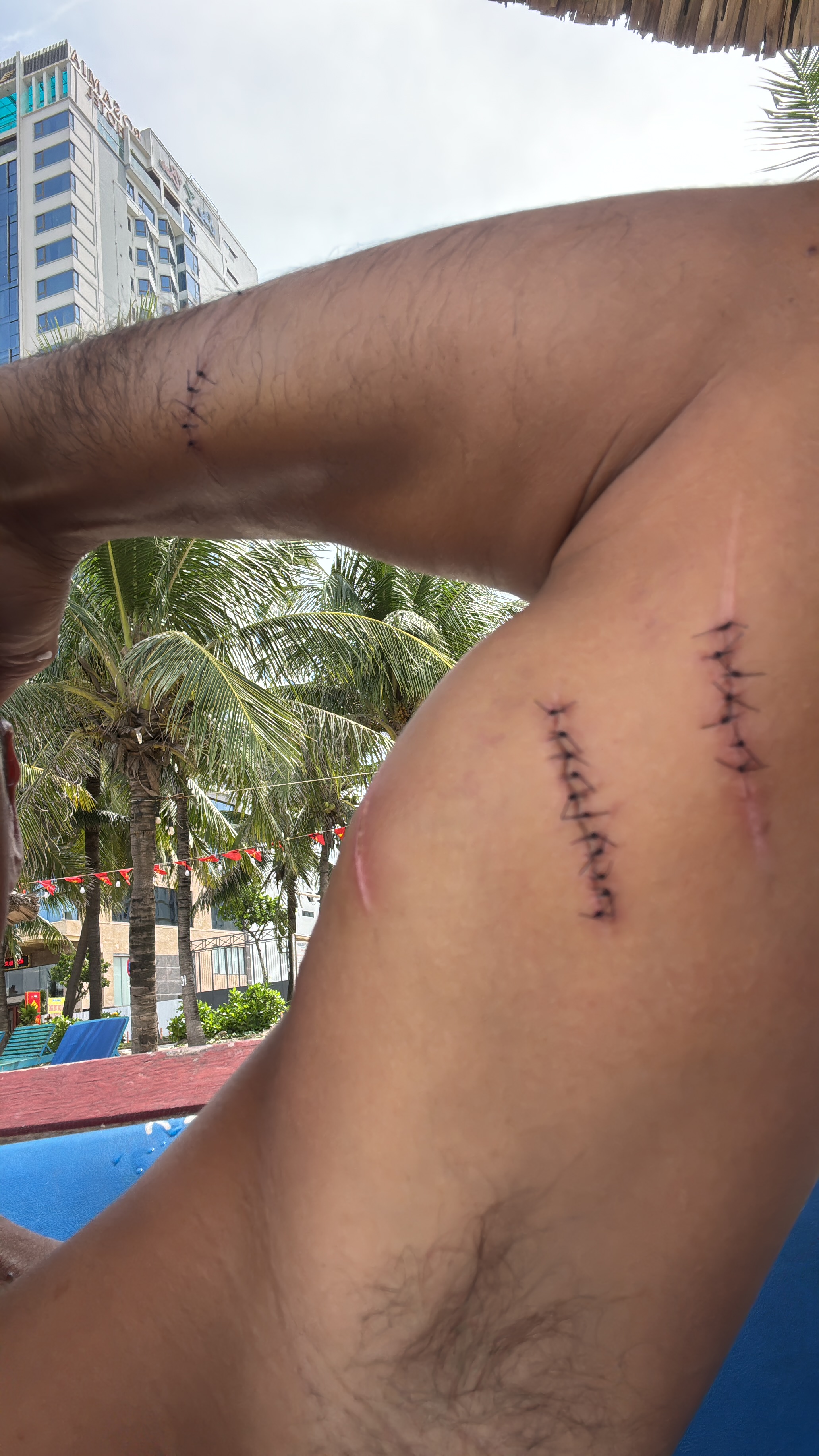 The stitches are still in. No infection. The bandages suck. Didn’t work. Probably shouldn’t be going in the ocean, but the waves were perfect! Couldn’t help myself. HAHAHAHA!