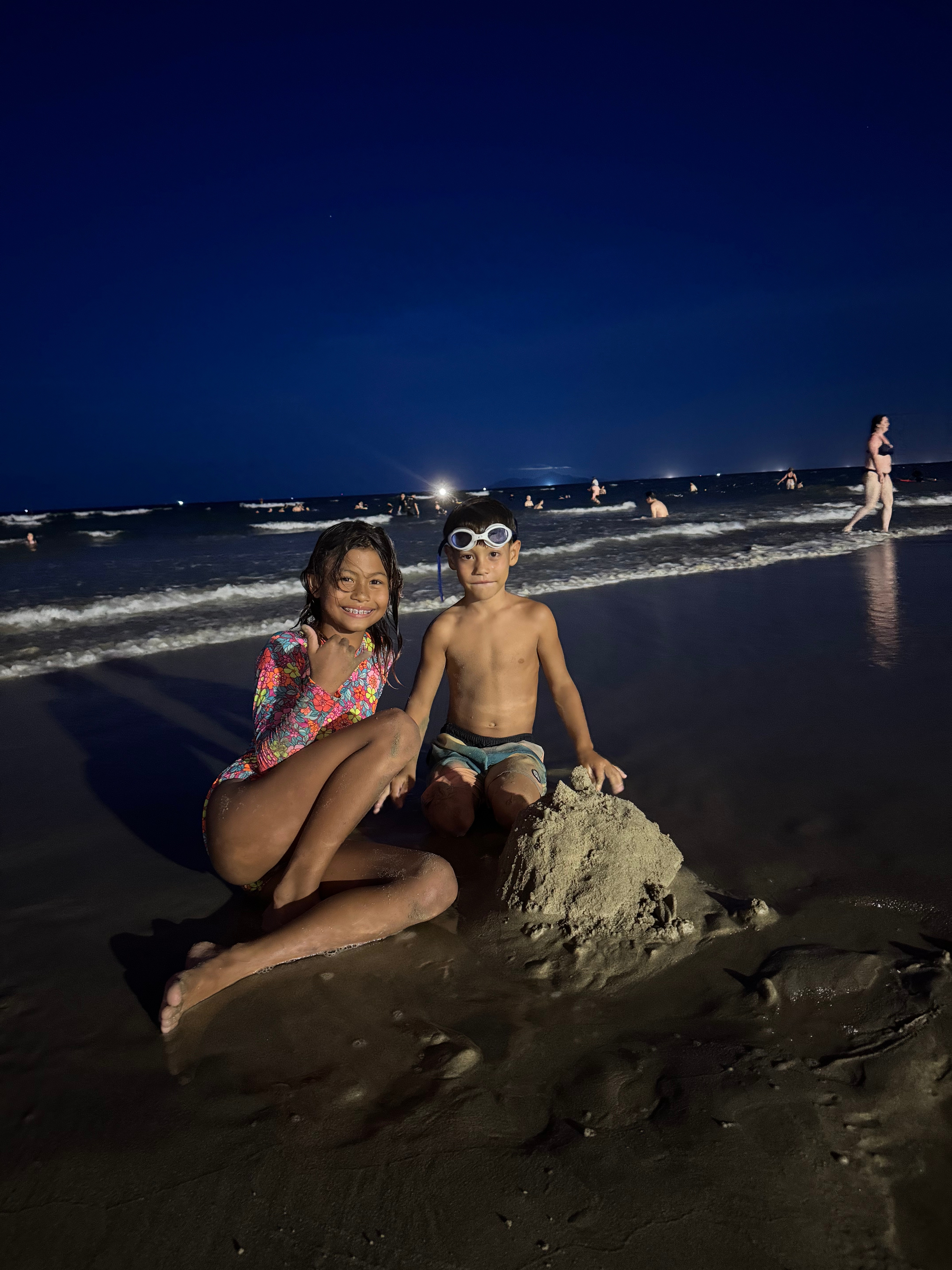 After unloading our stuff, we headed straight to the beach and quickly found our buddy Ollie. The brown guy with the foil! Sounds a lot like me. The ocean is so warm, you can keep swimming late into the night. Parts of the beach get lit up with lights making night swimming appealing. You could even surf if you wanted!