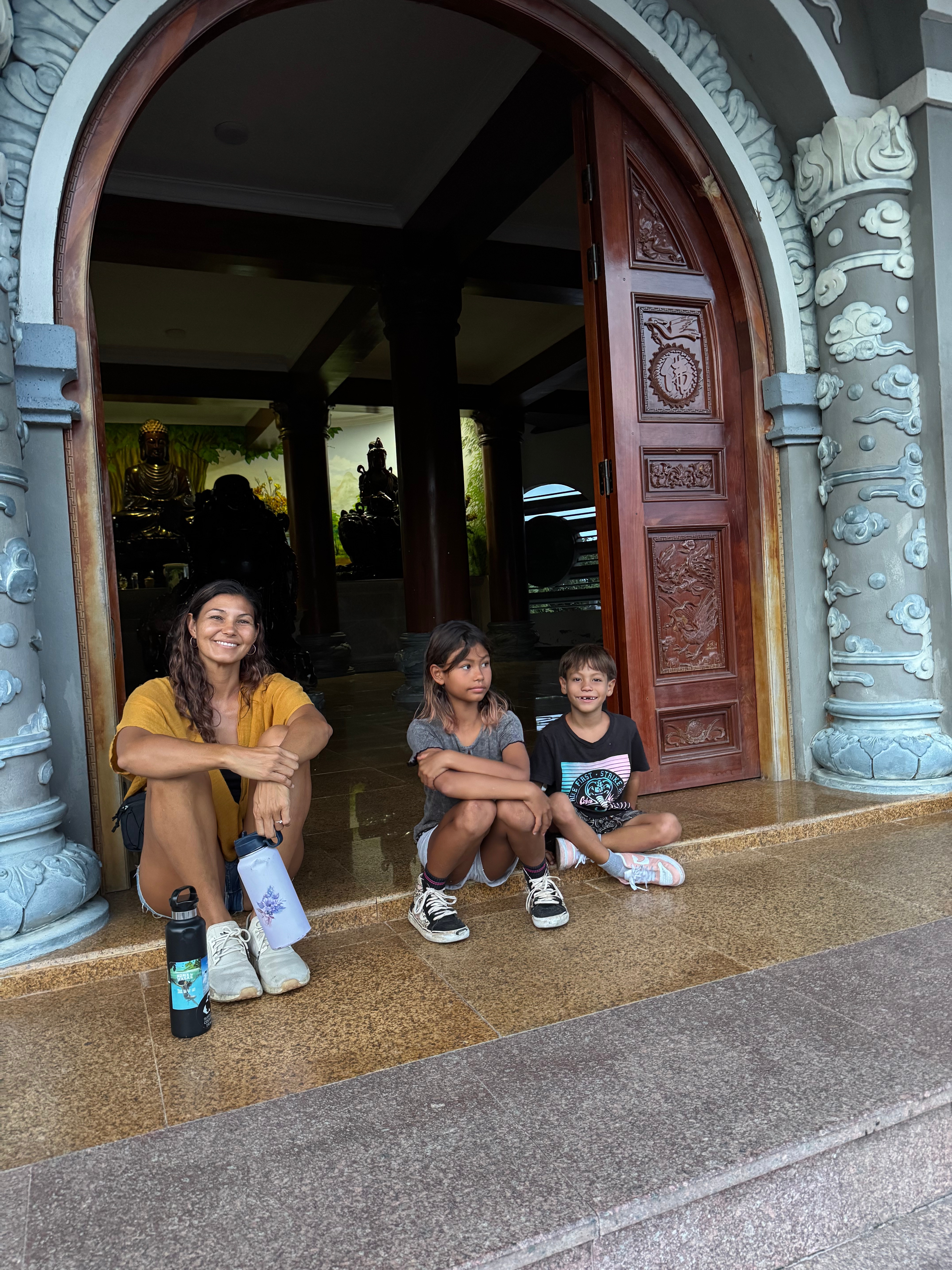 We planned on going to Ba Na Hills but after seeing the cost for the whole family, we decided against it. The company VinWorld creates lots of attractions around Vietnam and they all seem to be tourist traps. For some reason, you get drawn to them and this company is raking in the dough from the visitor industry. They’re kind of like a Disney/Disneyland deal. Regardless, we tried to dodge their attractions but still got stuck going to a few. In Da Nang though, we dodged Ba Na Hills and were happy to have done so. We ended up saving about $200 as a result. Money we got to spend in the community more. Instead of Ba Na Hills we went to the Buddha Statue and Monkey Forest up on the point on the north end of Da Nang. Other than the $5 taxi rides, there was no cost to explore the temple and surrounding area. At sunset it was beautiful and when the lights turned on, the place to on a whole new vibe. Kids were stoked, wife stoked, me stoked.