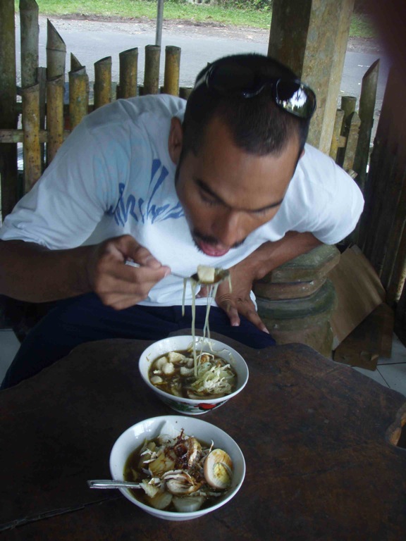 The bus was freezing cold. Here’s Kahi with his bundled head eating cup-a-noodle.